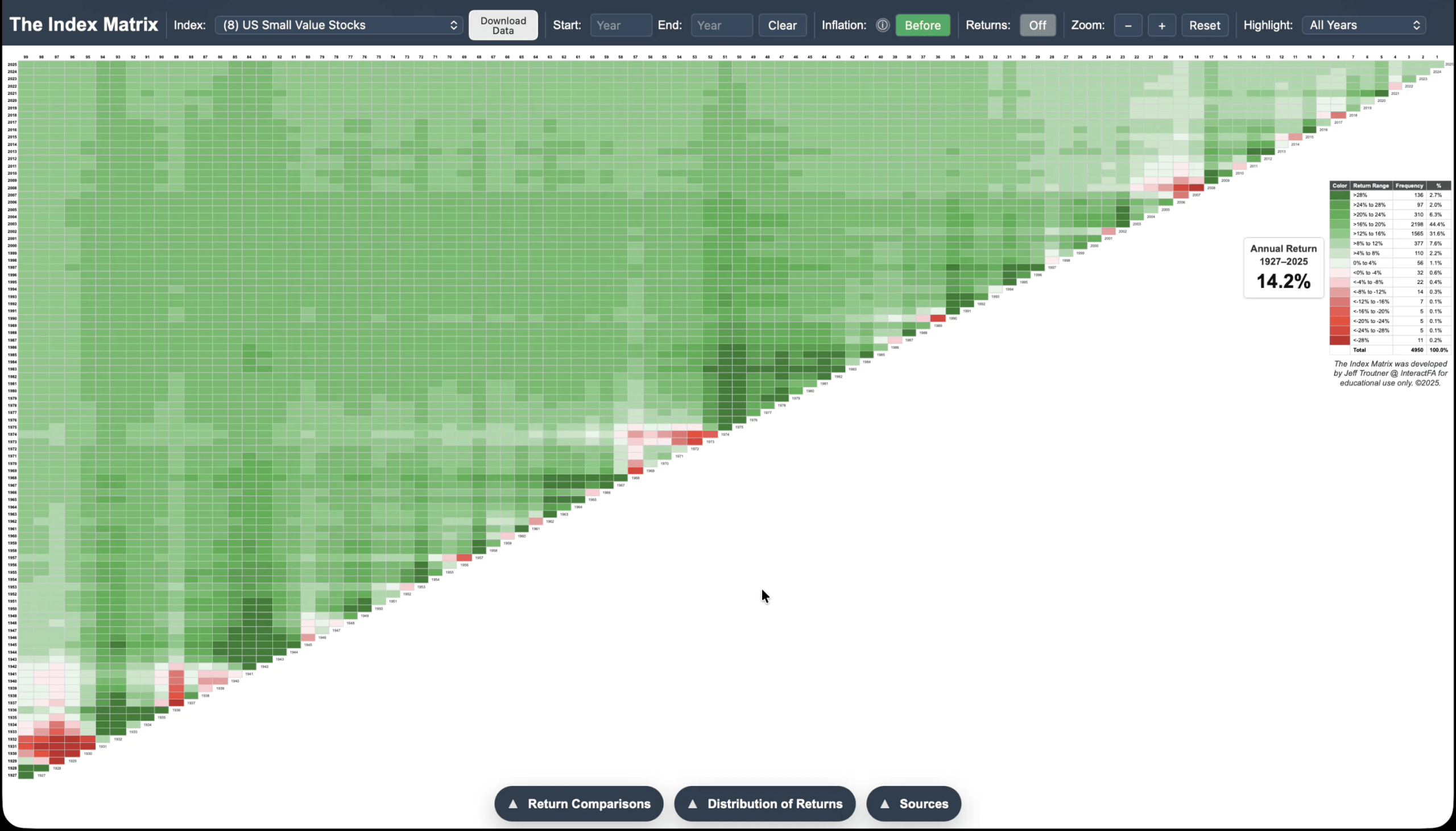 From any starting year along the diagonal, investors can view yearly returns from 1927 for most US indexes and annualized returns (up from the diagonal) for longer periods up to 99 years. Heat mapping of return ranges offers a big picture view of the “green pastures” the US stock market offers to patient investors who can get beyond the “barbed wire” of short-term return volatility.